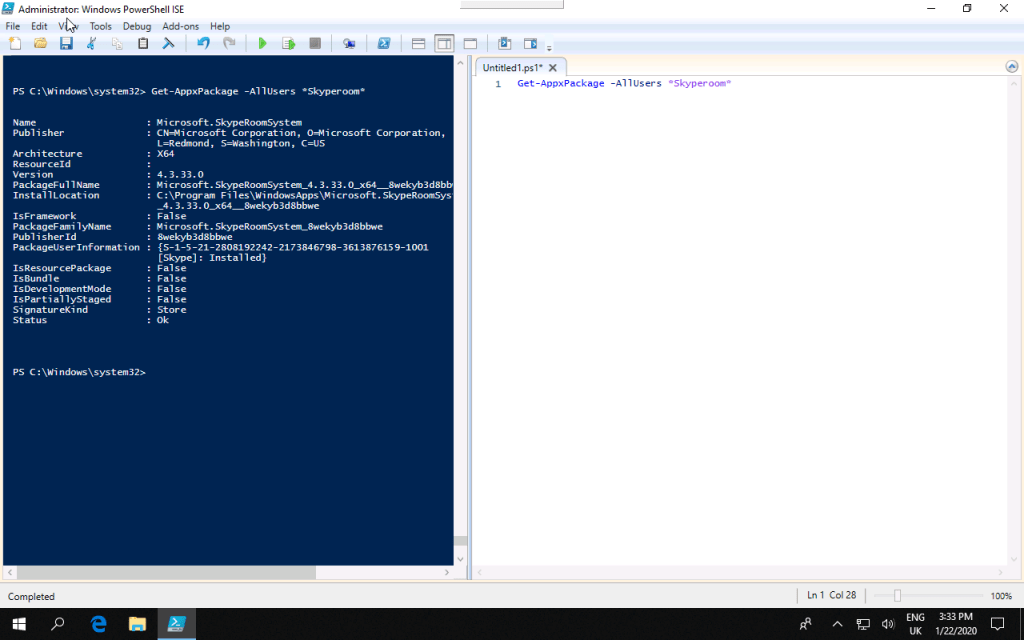 Get-AppxPackage -AllUsers *SkypeRoom*And the output looks like this.