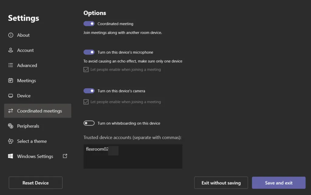 What does this mean anyway? Well coordinated meetings was designed to allow a Microsoft Teams Room to “pair” with a Microsoft Surface Hub. This means when you join a meeting, you can automatically bring in a Surface Hub. The official release on this is here and the user guide is here. So what about joining two MTRs together. Of course you can, just enter the device name you want to connect to and away you go. See below for the configuration page.