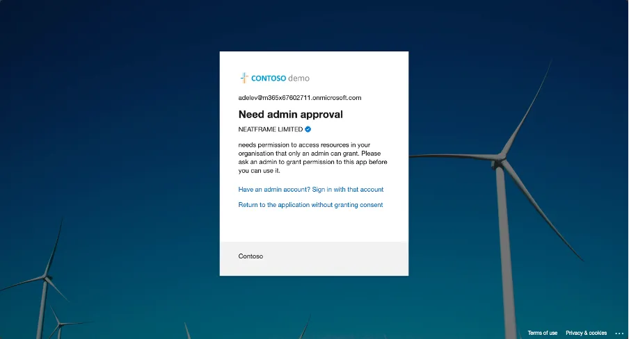 If you don’t have the required permissions to approve an Enterprise Application, you will then see this next screen. You will need to contact your Azure AD/Entra ID team for them to approve the enterprise application. I would make sense to request them be added to Neat Pulse too, so contact your Neat representative to get them invited to the Neat Pulse tenant.